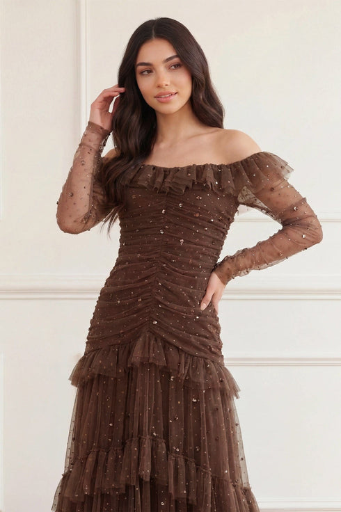 NEW SEASON | NEEDLE & THREAD EXCLUSIVE. The Sequin Glimmer Rouched Off-Shoulder Gown in Chocolate. Designed with a romantic neckline and soft ruching through the bodice. A glamorous evening silhouette with gentle drape and sparkle, it creates a striking occasion wear look.