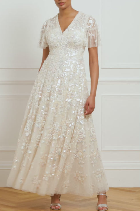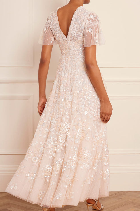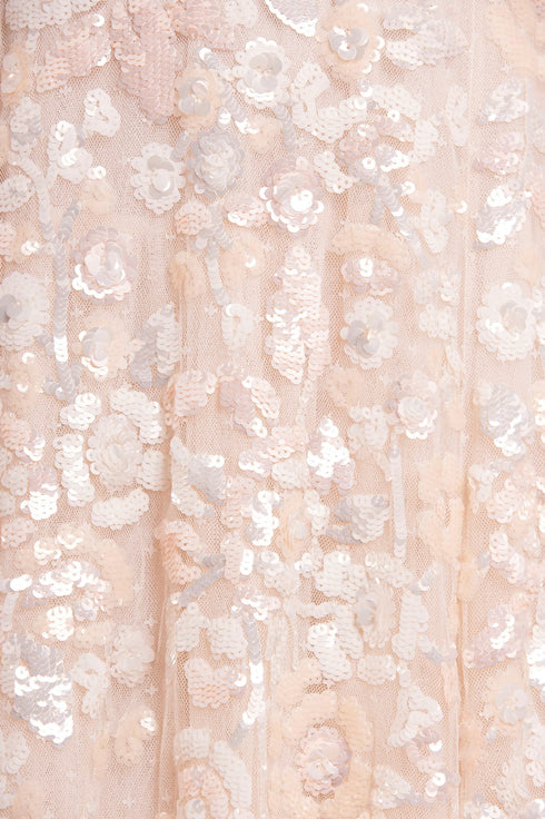 The Sequin Paradise Short Sleeve Gown in Cream. This gown is beautifully embellished with an intricate sequin artwork, inspired by one of our key prints - paradise garden. The sequins are depicted in rich tones of pink and greens creating this enchanting floral artwork. Developed with generous layers of net to create a show-stopping skirt shape. A true Needle & Thread statement piece.