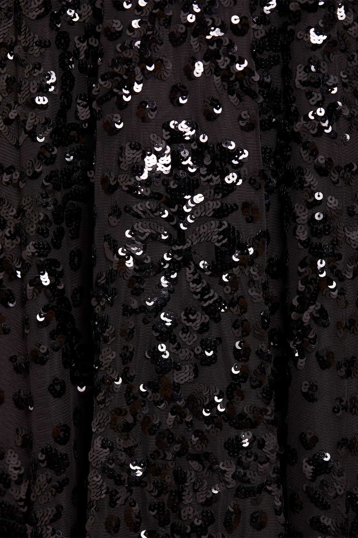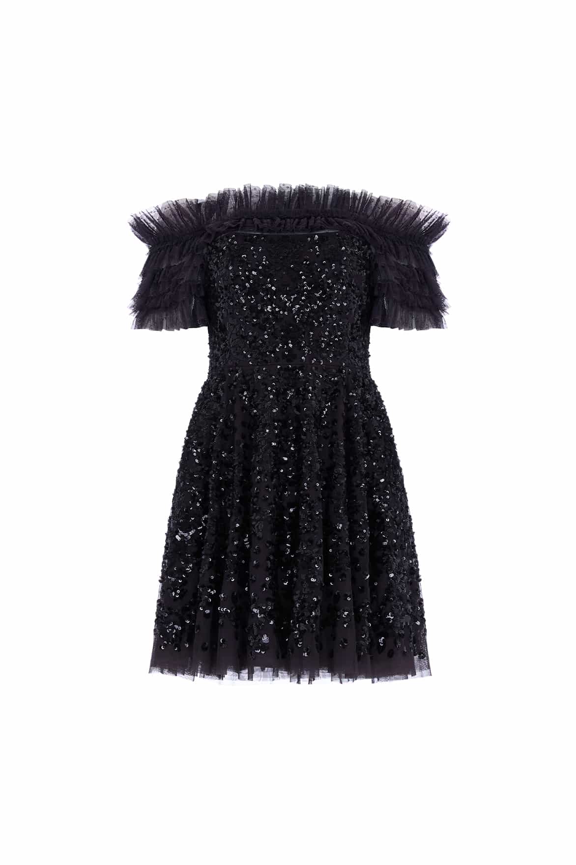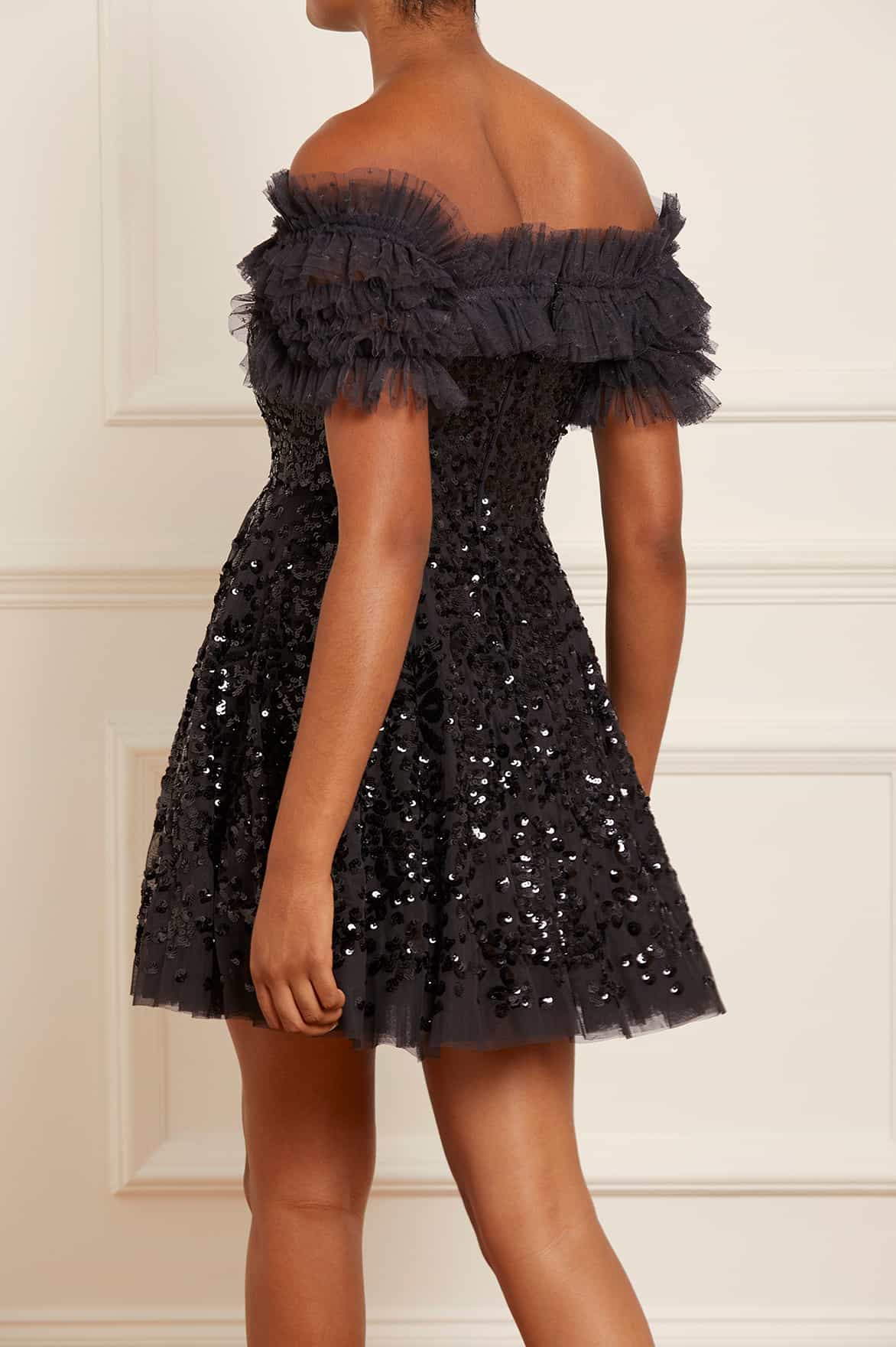 The Sequin Wreath Off-Shoulder Micro Mini Dress in Graphite. This beautiful dress is crafted with an iconic off-the-shoulder design. Adorned with layers of delicate ruffles, along with an elasticated panel for comfort and hold. This dress is beautifully decorated with shimmering sequins inspired by a vintage lace curtain. Developed with an integrated corset for the perfect shape and structure. A truly magical piece.