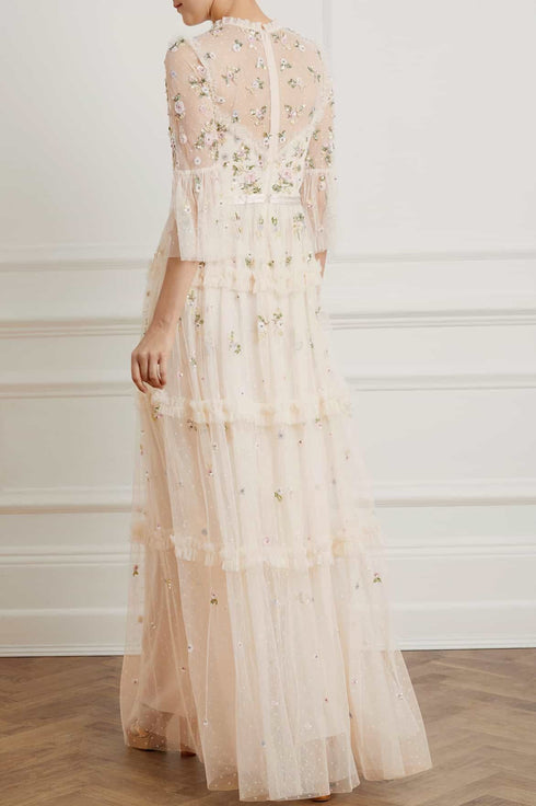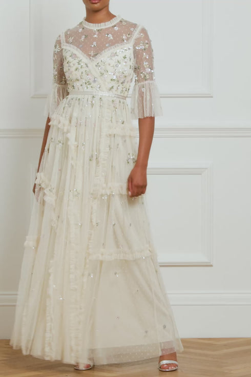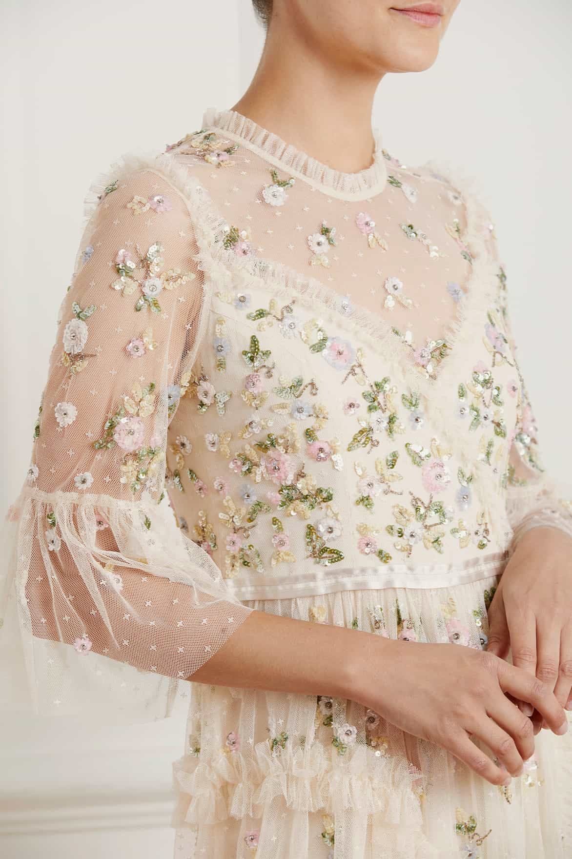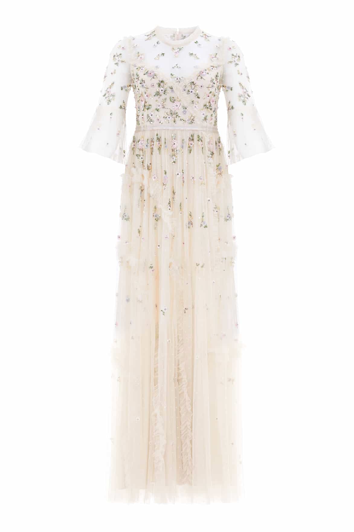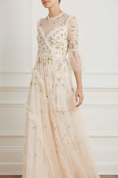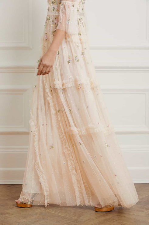 NEEDLE & THREAD EXCLUSIVE. The Shimmer Ditsy Long Sleeve Gown in Champagne. Beautifully decorated with floral multi-coloured cluster motifs, depicted in soft white, pink and bronze tones. Crafted with kisses tulle, adorned with deconstructed seams and intricate ruffle trims, creating a romantic, contemporary silhouette. Designed with long, sheer sleeves and our signature grosgrain ribbon at the waist. Shimmer under the spotlight in your new wardrobe staple.