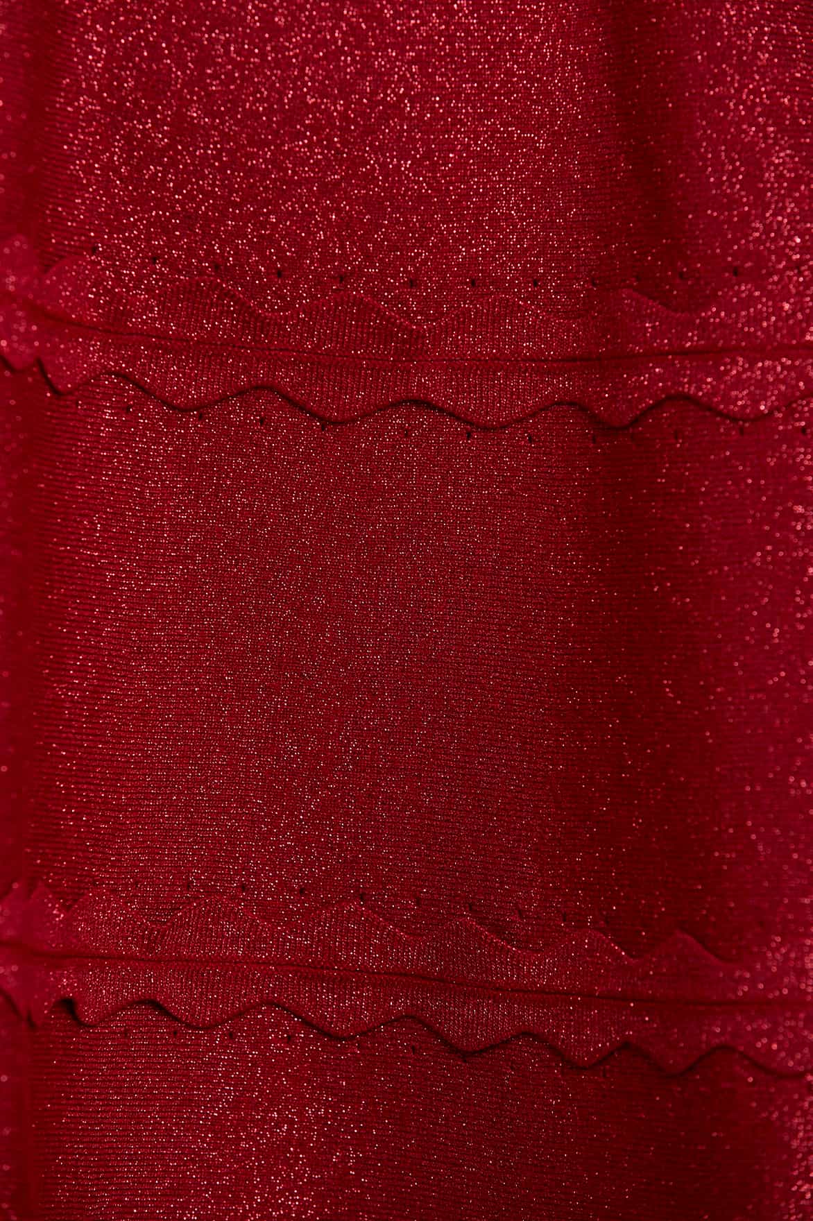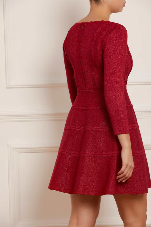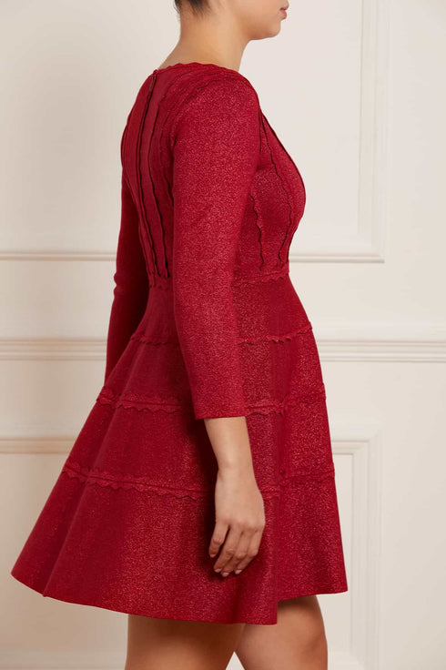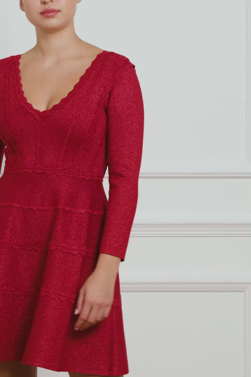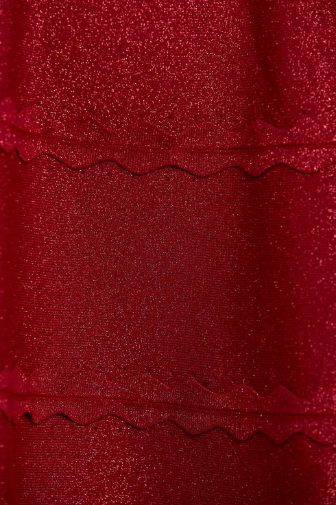 The Shimmer Knit Mini Dress in Deep Red. This mini dress is designed with a shimmer knit fabric inspired by vintage textiles. Crafted intricately with knitted scallop trims for signature Needle & Thread detailing. Developed from a responsibly sourced stretch viscose, twisted with tonal lurex for a delicate subtle shimmer. Designed with a fitted bodice and V-neckline for a flattering silhouette. The perfect dress to take you from day to night.