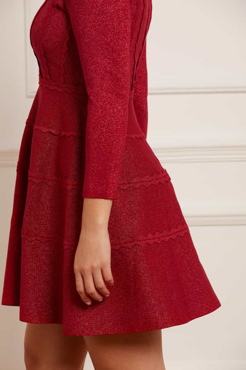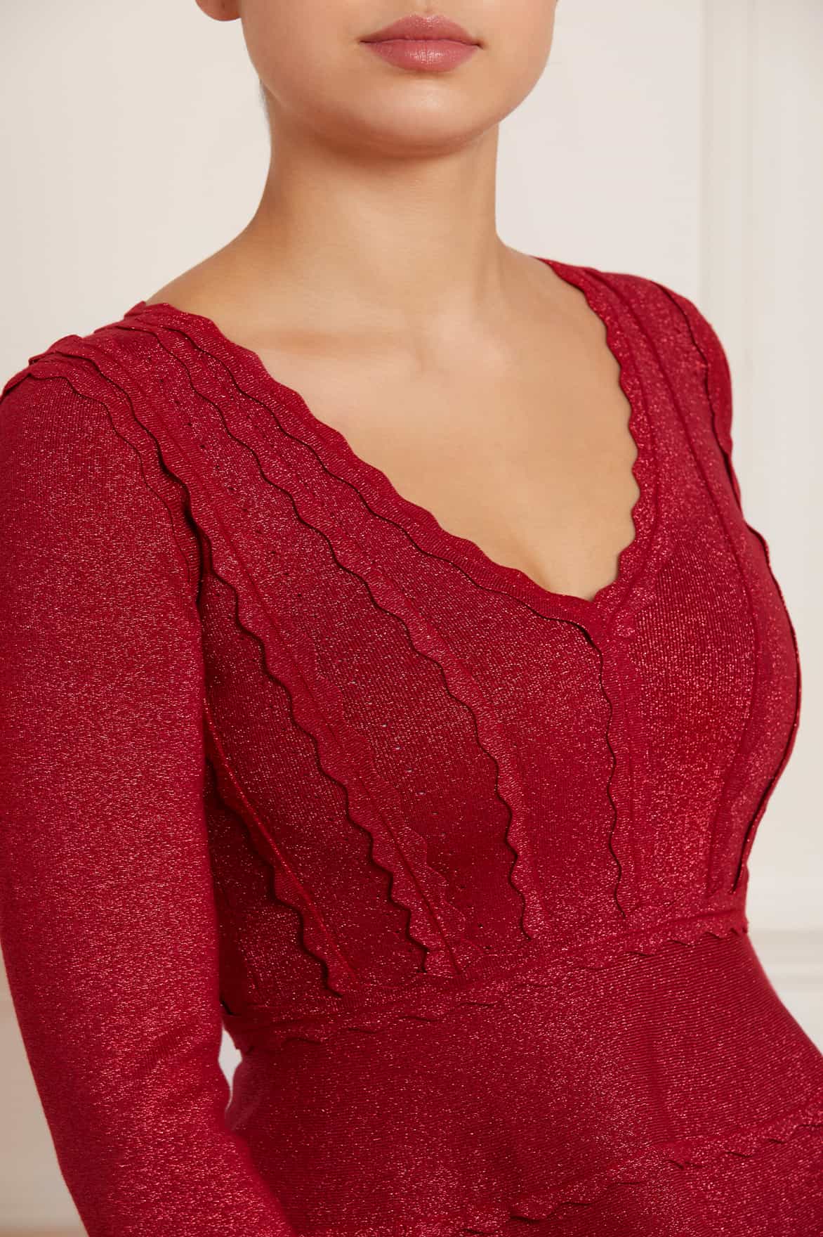 - Knitted stretch viscose dress with metallic fibre, decorated with scallop trims