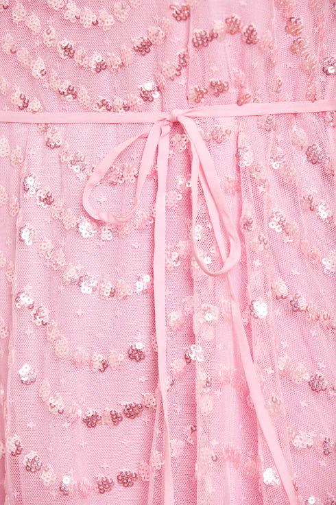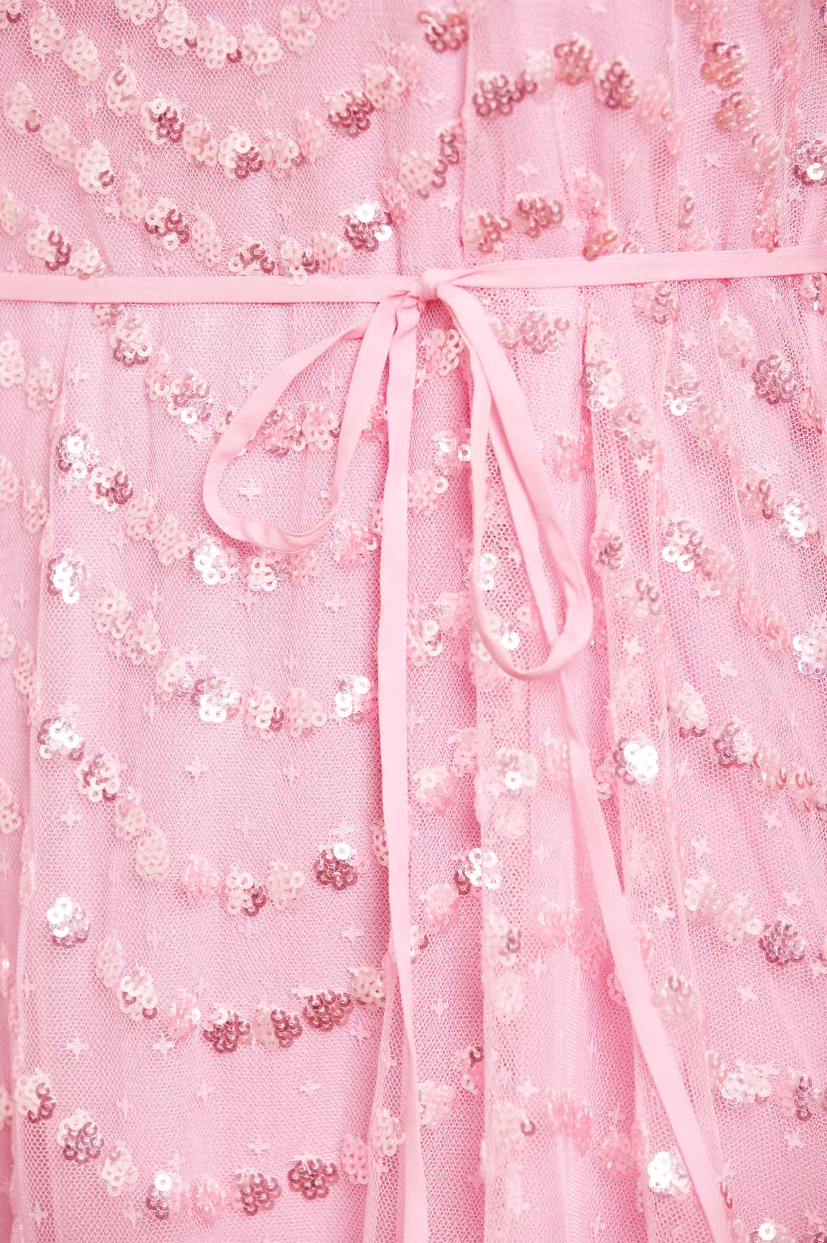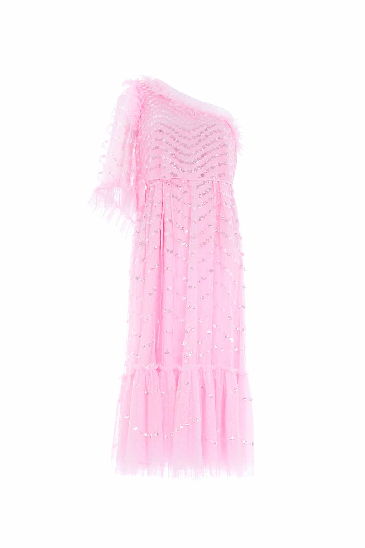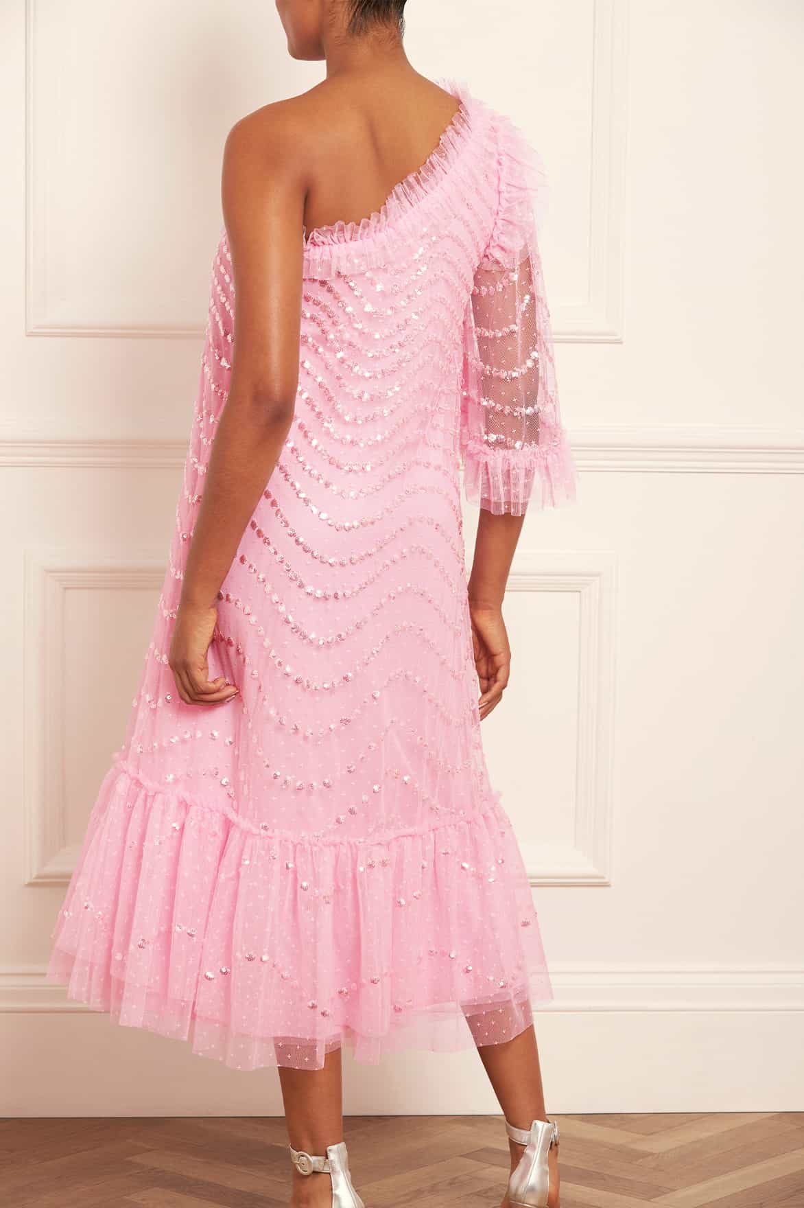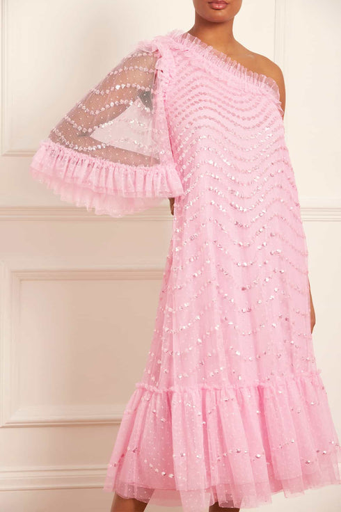 NEW SEASON. The Shimmer Wave Gloss One-Shoulder Ballerina Dress in Blossom Pink. This ballerina dress is developed with a one-shoulder design and a generous, voluminous sleeve for elegant detail. Adorned with a shimmering artwork in high gloss sequins. This style is inspired by the sea waves of the Riveria, featuring delicate sequins creating undulating borders for a romantic, glistening effect. The skirt is made up of layers of signature Needle & Thread soft tulle. A Needle & Thread season favourite.