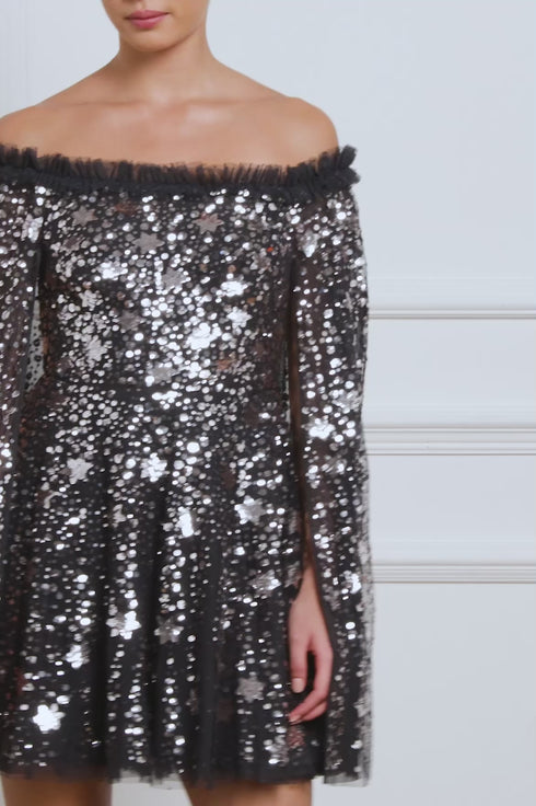 The Shooting Stars Cape Micro Mini Dress in Graphite/Silver. This dress is adorned with shimmering embellishments of intricate star motifs, with clusters of tiny sparkling sequins that scatter towards the hem, creating a breathtaking effect. Inspired by the extravagant costumes worn by the Follie’s dancers of the early 1900s, this statement dress features an exquisite, embellished cape integrated into the dress. The elegant, flattering neckline is adorned with signature Needle & Thread frills, while the skirt is developed of layers of signature Needle & Thread soft tulle for romantic styling.