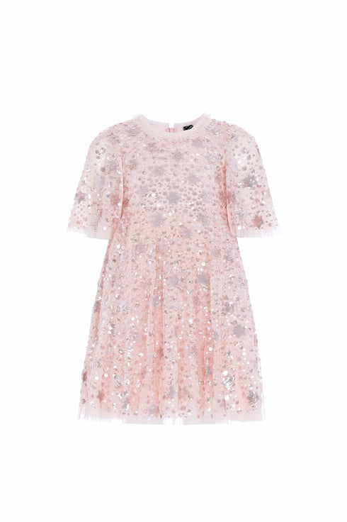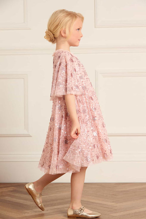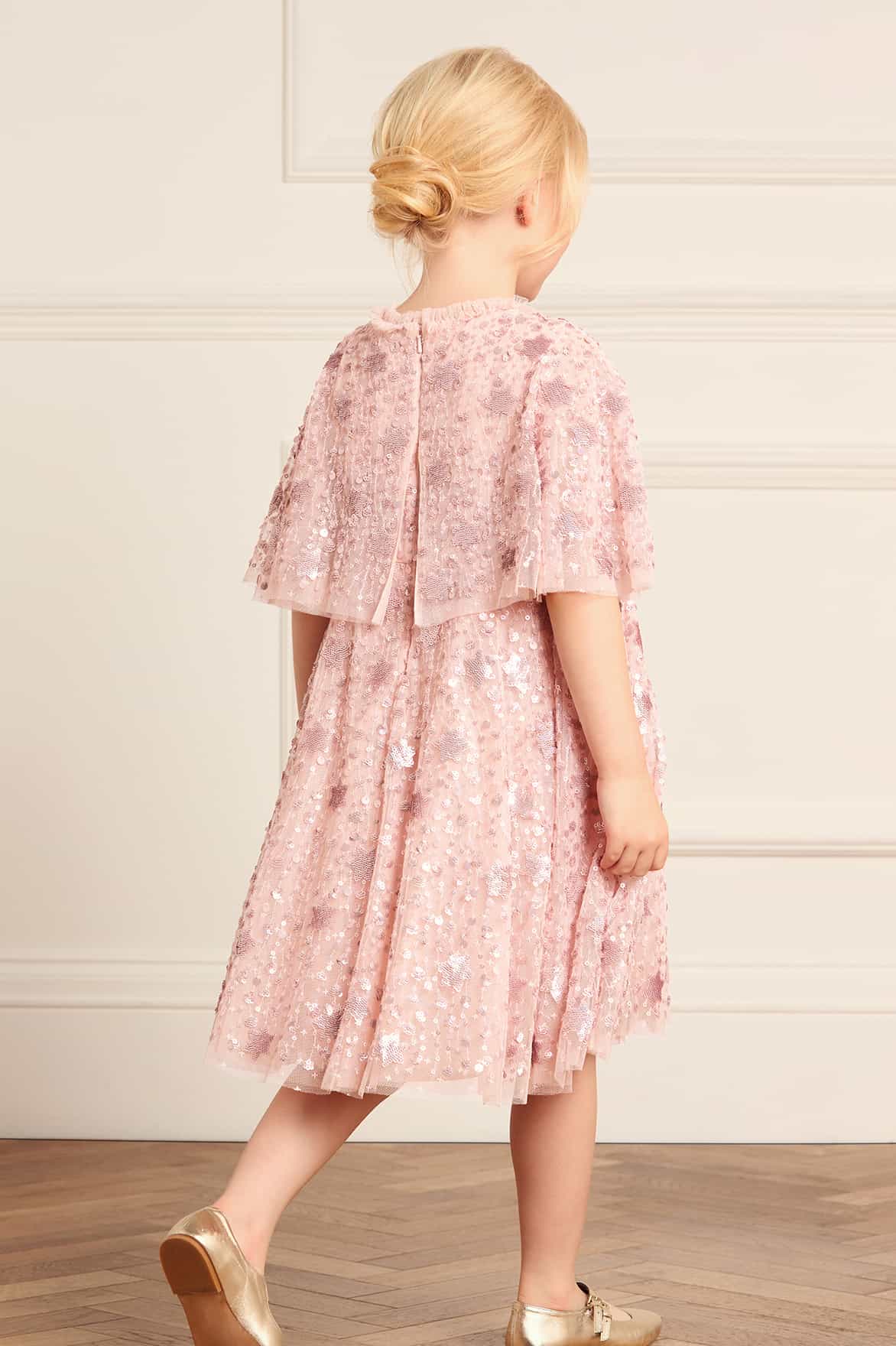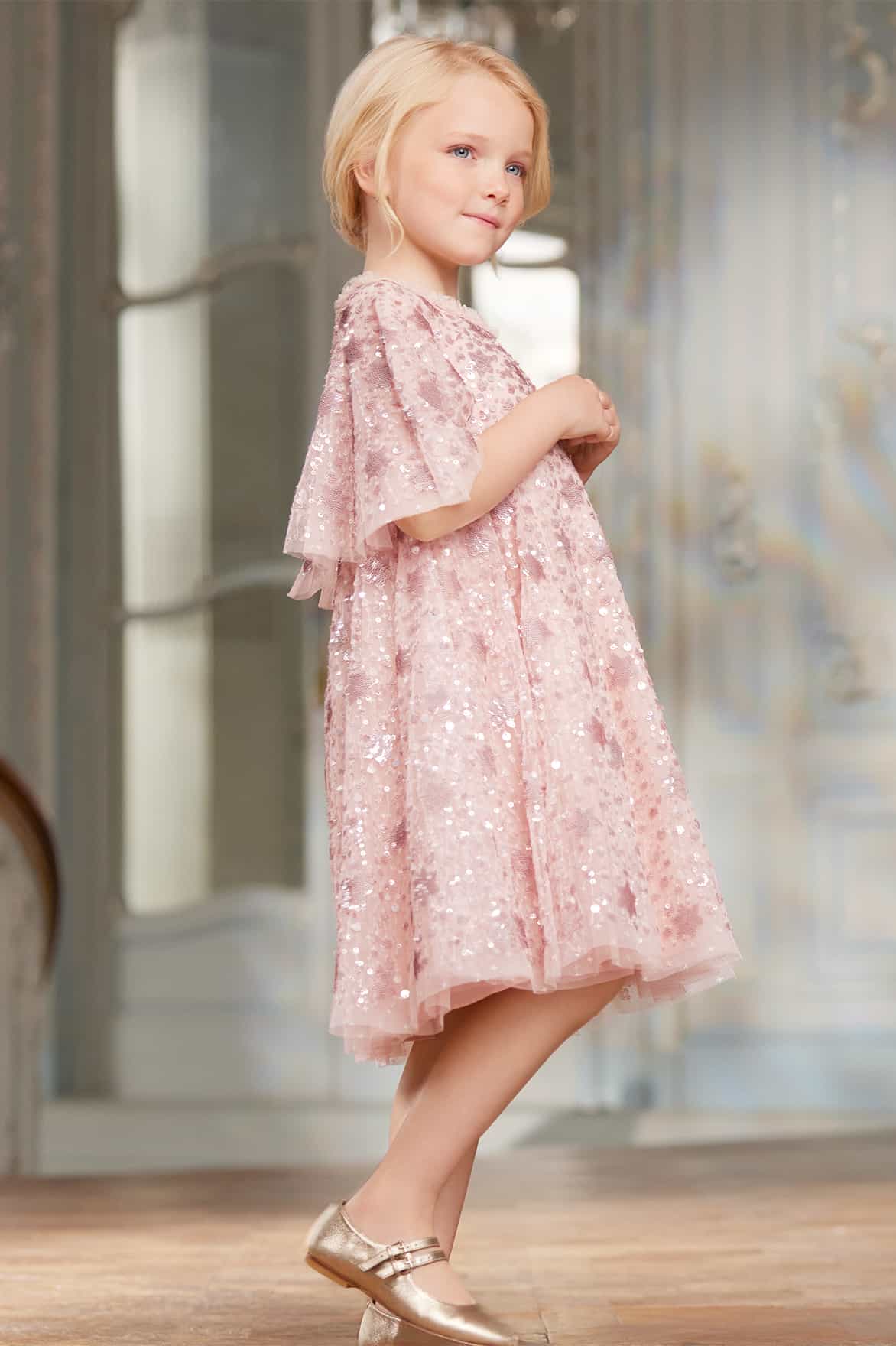 The Shooting Stars KIDS Dress in Pink/Rose Gold. This dress is inspired by the extravagant costumes worn by the Follie’s dancers of the early 1900s. Beautifully decorated with embellishments of intricate star motifs, with clusters of tiny sparkling sequins that scatter towards the hem, creating a shimmering effect. The dress is adorned with signature Needle & Thread tulle ruffles and frills. The skirt features generous layers of net and tulle with a sweeping hemline, perfect for twirling. The loose-fit silhouette ensures easy-to-wear styling. This dress captures the magic of fairytales and the beauty of the night sky.