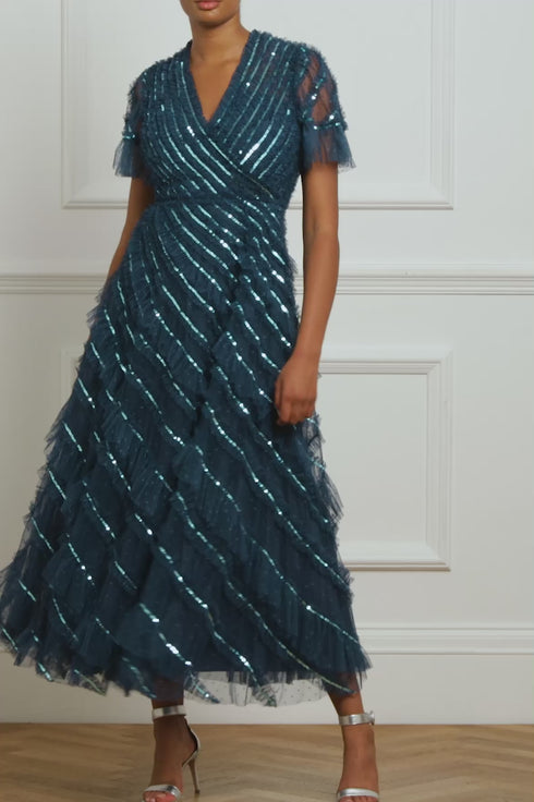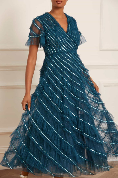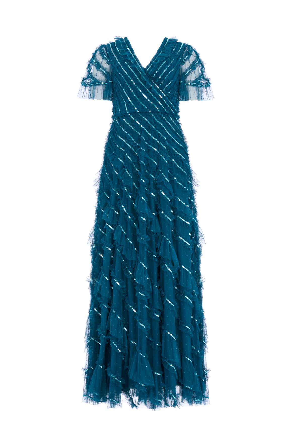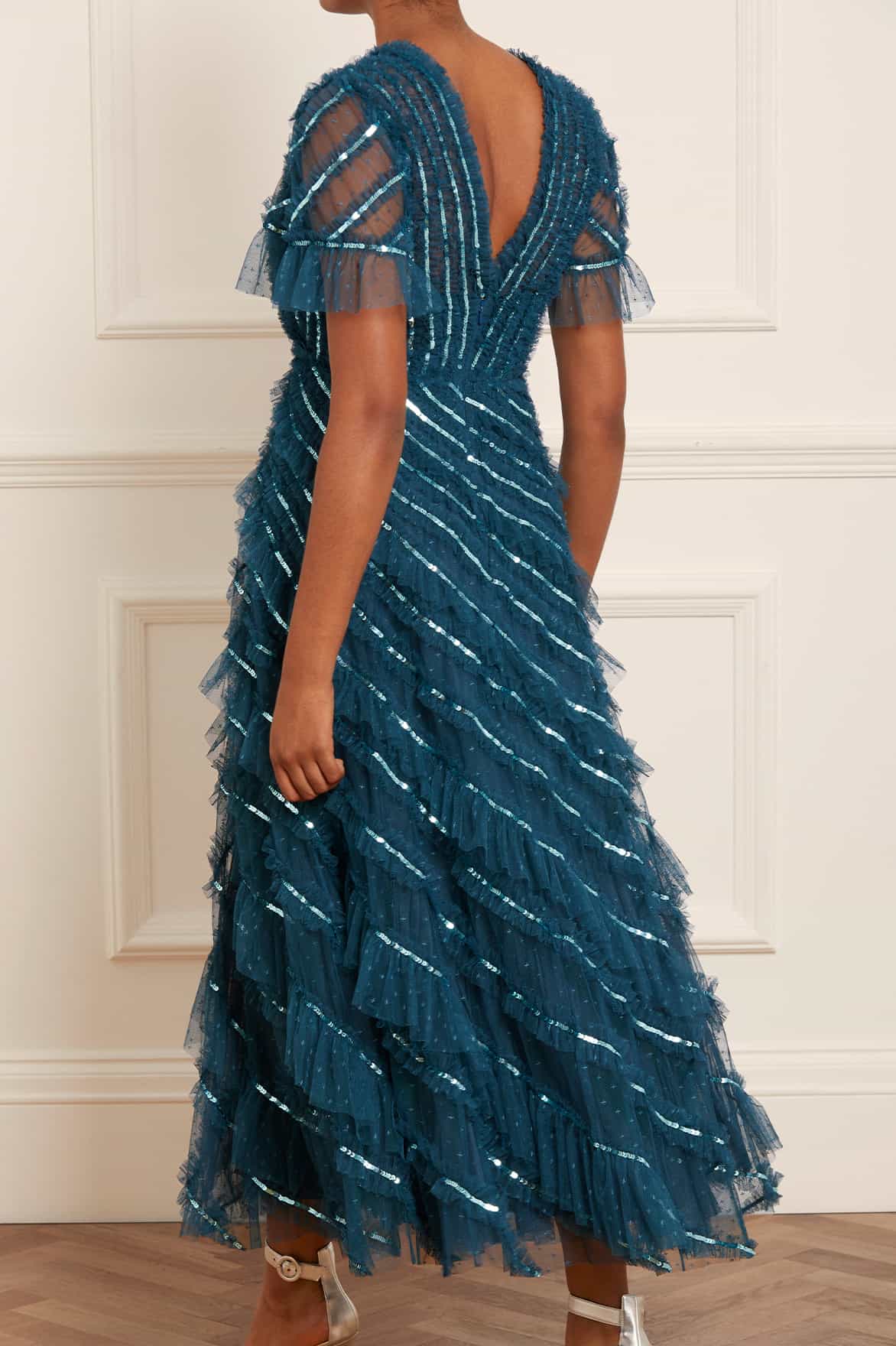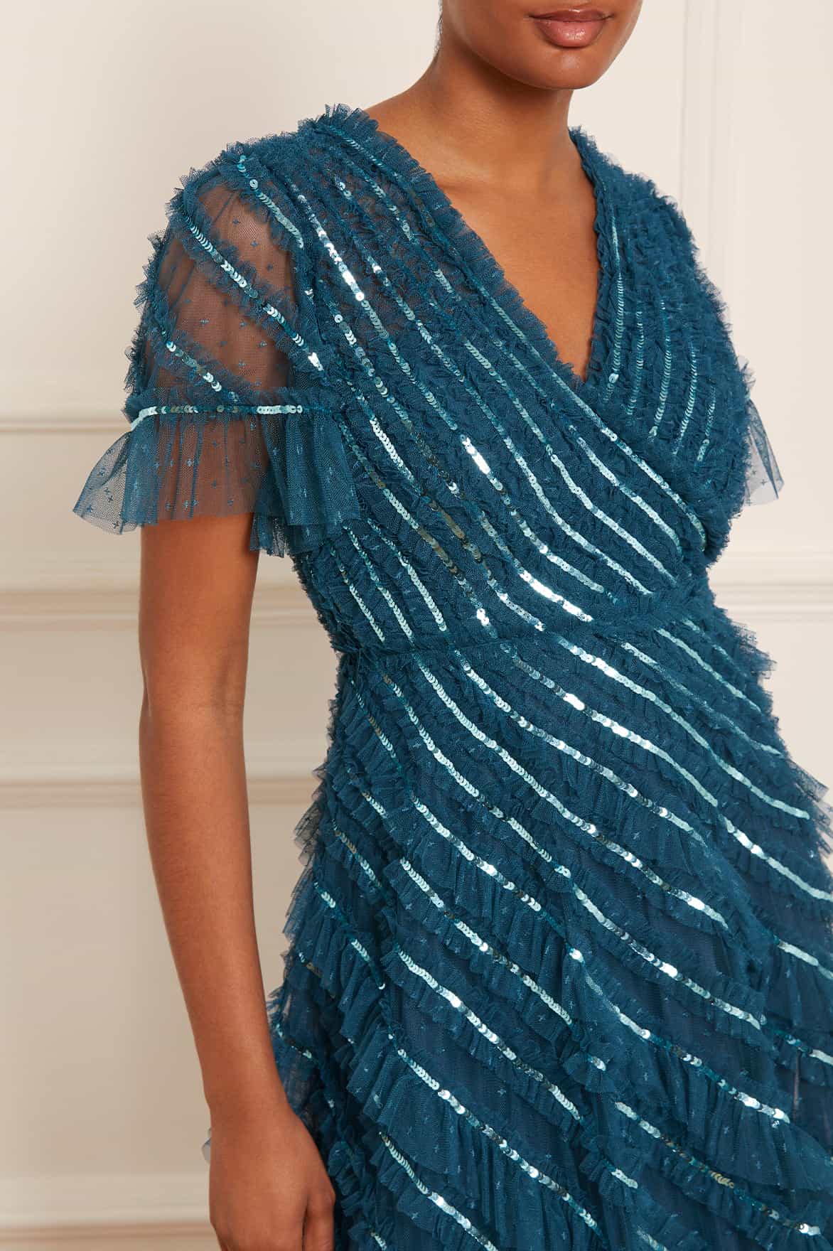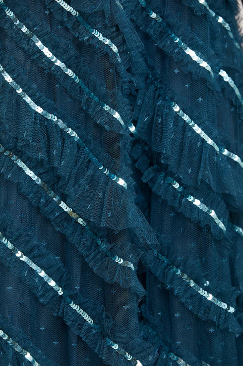 The Spiral Sequin V-Neck Ankle Gown in Teal. A brand new style for the season ahead. This gown is a true statement piece, featuring all over frothy texture to create a signature Needle & Thread look. Beautifully engineered with gathered, spiral texture and intricate, shimmering sequins adorning each individual frill creating an enchanting effect. Make an appearance in this romantic style.