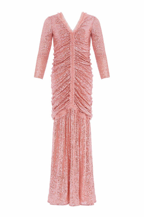 The Starlight Long Sleeve Gown in Rose Blossom. Specially developed all-over sequin fabric is created using the tiniest 3mm sequins, carefully and delicately stitched to the stretch mesh base to create a shimmering effect. Expertly draped in our London atelier, the fabric is gathered with tulle frill details to perfect the flattering silhouette and add statement Needle & Thread styling. Fully lined in heavier-weight power mesh, the gown ensures ultimate fit and comfort. The frill-edged V neckline and slim sleeves complete the elegant silhouette. The perfect gown for an upcoming special occasion.
