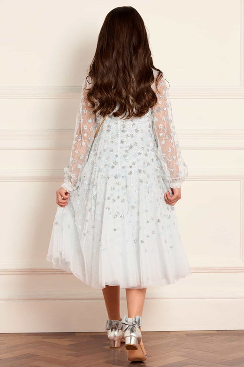 NEW SEASON. The Starry Nights Kids Dress in Ice Blue. Features twinkling star sequins cascading across soft tulle. With a full, gathered skirt and a gentle sparkle, it’s made for moments that feel truly magical. This dress pairs beautifully with the Starry Nights Round Neck Gown from the womenswear line for a timeless coordinated look.