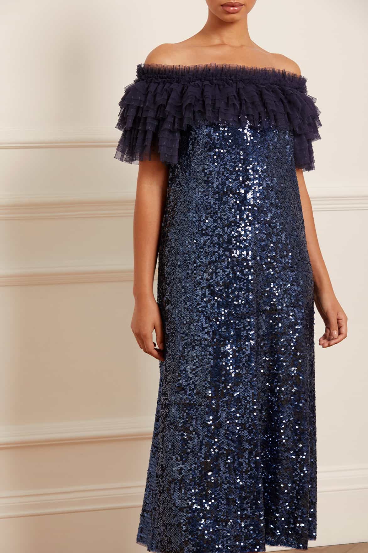 The Stephanie Ballerina Dress in Navy. A brand new party style for the season ahead. Beautifully crafted with a statement ruffle off-the-shoulder design, developed from layers of tulle and net to create this playful look. The neckline and sleeves are fully elasticated along the top edge for comfort. Decorated with rich, shimmering sequins to create an enchanting, glistening effect. Expect all eyes on you in this magical, fun style.