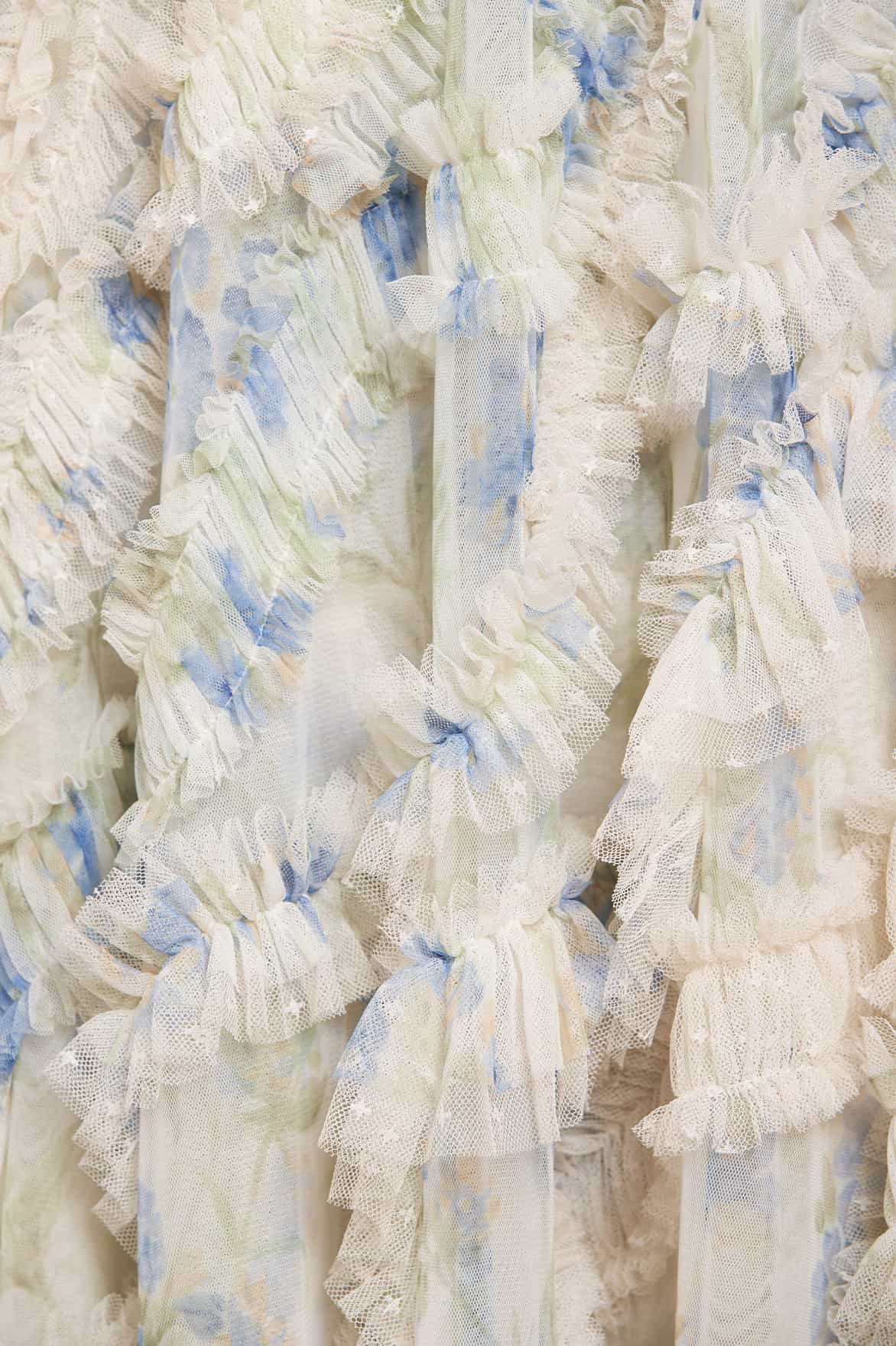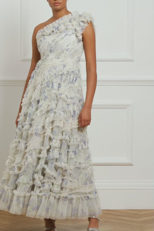 The Summer Posy Aaliyah One-Shoulder Ankle Gown in Moonshine. The print of this dress is taken from a 1930’s hand-painted wallpaper design. The artwork features a series of powder blue posies scattered in a soft formation. Designed with intricate, gathered frills featuring undulating, wave like borders. Developed with a one-shoulder design with layered soft tulle ruffles along the neckline to create a statement silhouette. The skirt is made from generous layers of net and tulle for a sweeping hemline. Expect all eyes on you in this romantic gown.