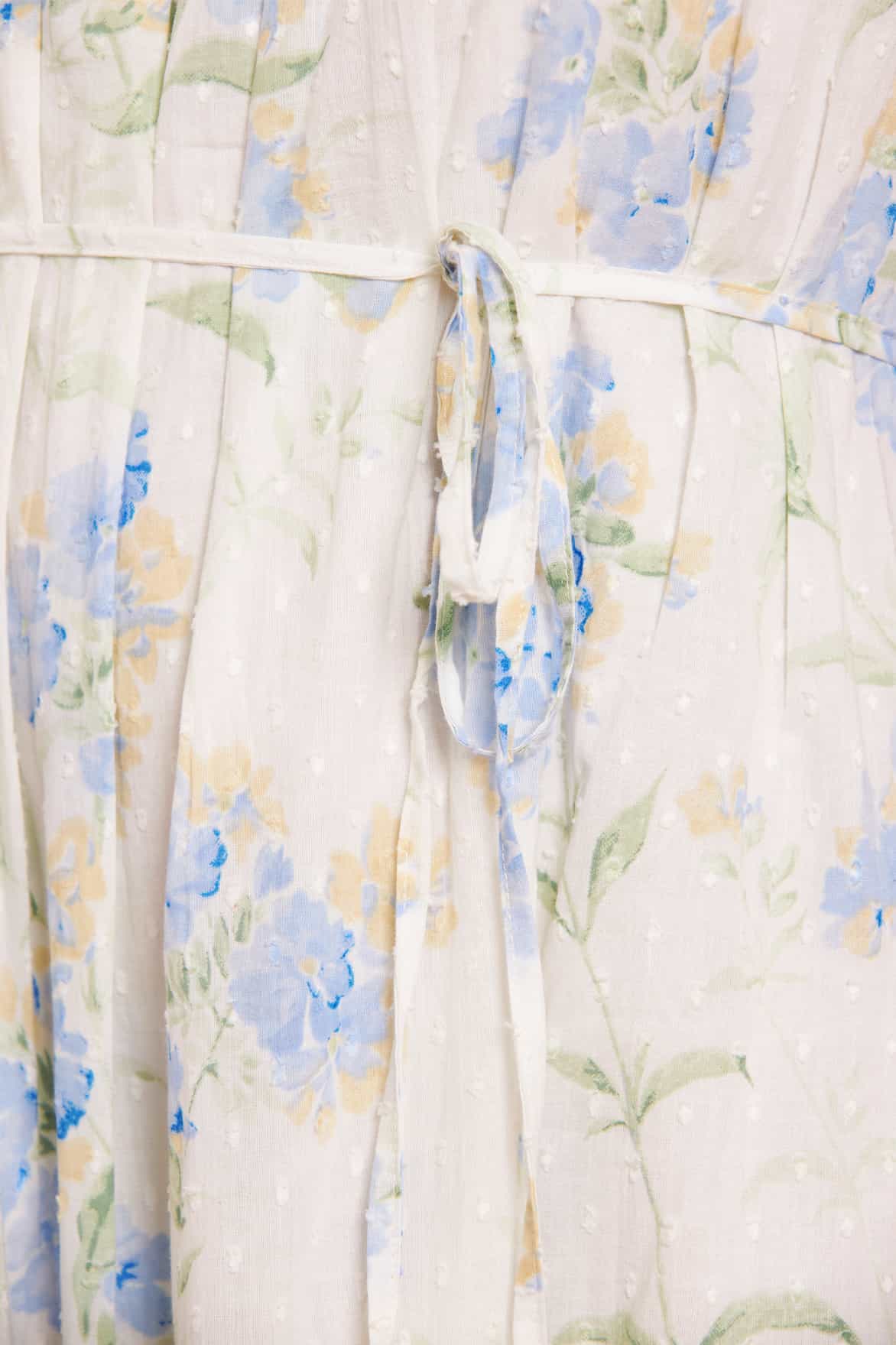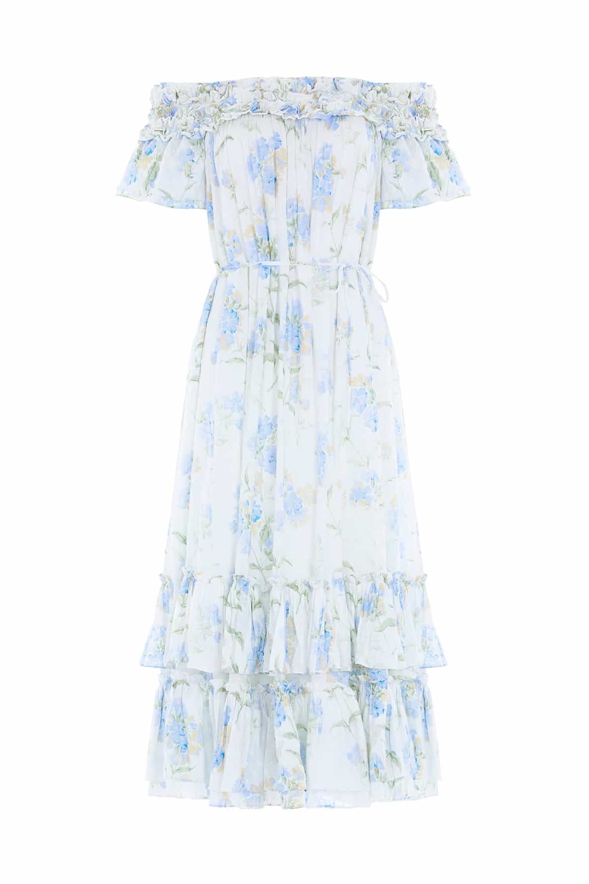 The Summer Posy Cotton Off-Shoulder Ankle Gown. The print of this dress is taken from a 1930’s hand-painted wallpaper design. The artwork features a series of powder blue posies scattered in a soft formation. This ankle gown features an off-the-shoulder design with ruffles creating an effortless Needle & Thread textile. Developed from soft, organic cotton with a loose, easy-fit texture for versatile styling. The perfect wardrobe staple.