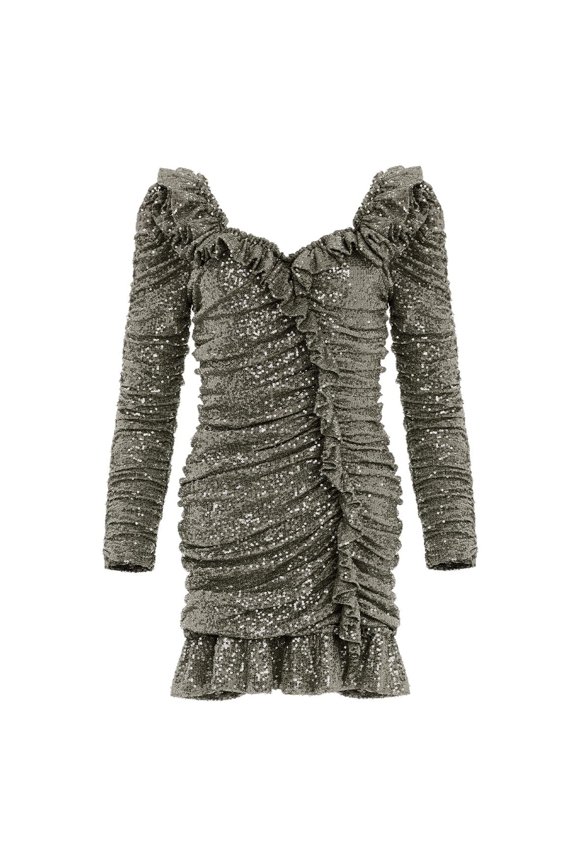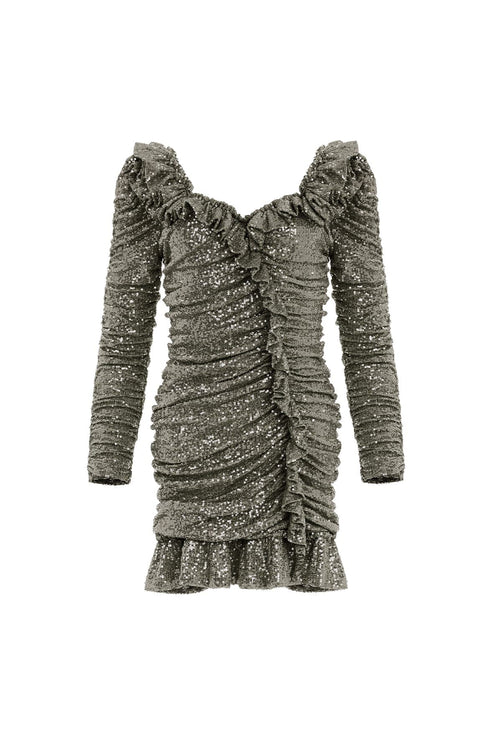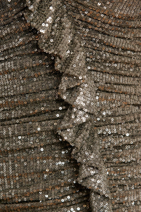 The Sunbeam Rouched Long Sleeve Micro Mini Dress in Juniper. A brand new style for the season ahead. This dress is made from specially sourced sequin fabric, created using the tiniest sequins carefully stitched to the stretch mesh base, creating an all-over shimmering fabric. This mini dress is developed with a flattering silhouette using an expert technique featuring folded frill details for Needle & Thread signature elements. This style is fully lined in power mesh to create ultimate fit and comfort. The perfect piece to shine in golden hour.