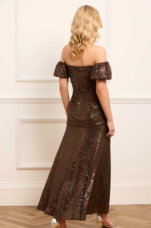 The Sunbeam Valentina Off-Shoulder Gown in Chocolate. Turn heads in the dazzling gown. Featuring shimmering 3mm sequins on stretch mesh, an off-shoulder silhouette, and a fluid skirt, this design exudes timeless elegance. Crafted with romantic puff sleeves and soft draping flatter the figure, while an internal corset ensures comfort and support. Perfect for glamorous soirées, this gown promises unforgettable sophistication.