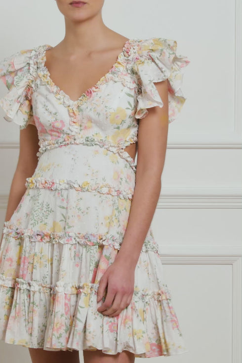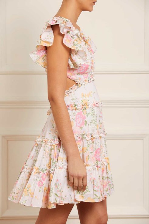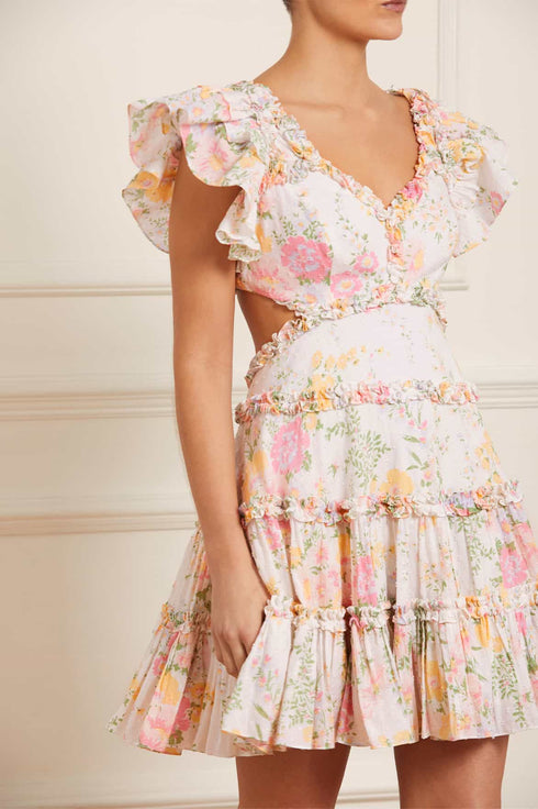 The Sunrise Bloom Backless Cotton Micro Mini Dress in Moonshine. This backless cotton mini dress is adorned with a summer floral print inspired by an early 1900's hand-painted design. Developed with florals in a soft, sunset shade for a playful palette. Crafted in our soft, organic cotton featuring signature Needle & Thread frills. Designed with an open back, created in the most flattering and secure way, with a button finish at the top neck. A transitional day to night piece.
