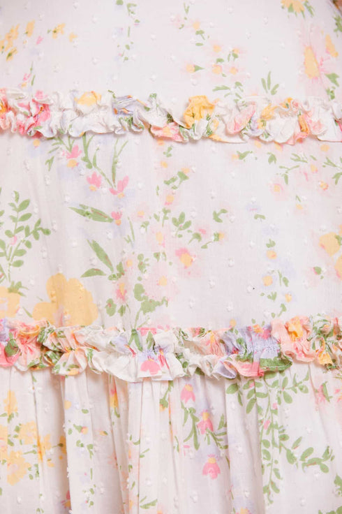 - Organic textured cotton decorated with floral print and cotton ruffles