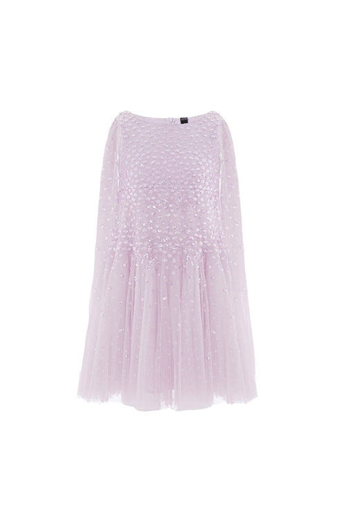 NEW SEASON. The Sunrise Sequin Cape Kids Dress in Powder Lilac. This enchanting kids dress is adorned with softly shimmering sequin dots arranged in gentle linear bands for a luminous effect. Designed with a relaxed fit, flowing cape detail and full skirt, it creates graceful movement. Perfect for a party moment.