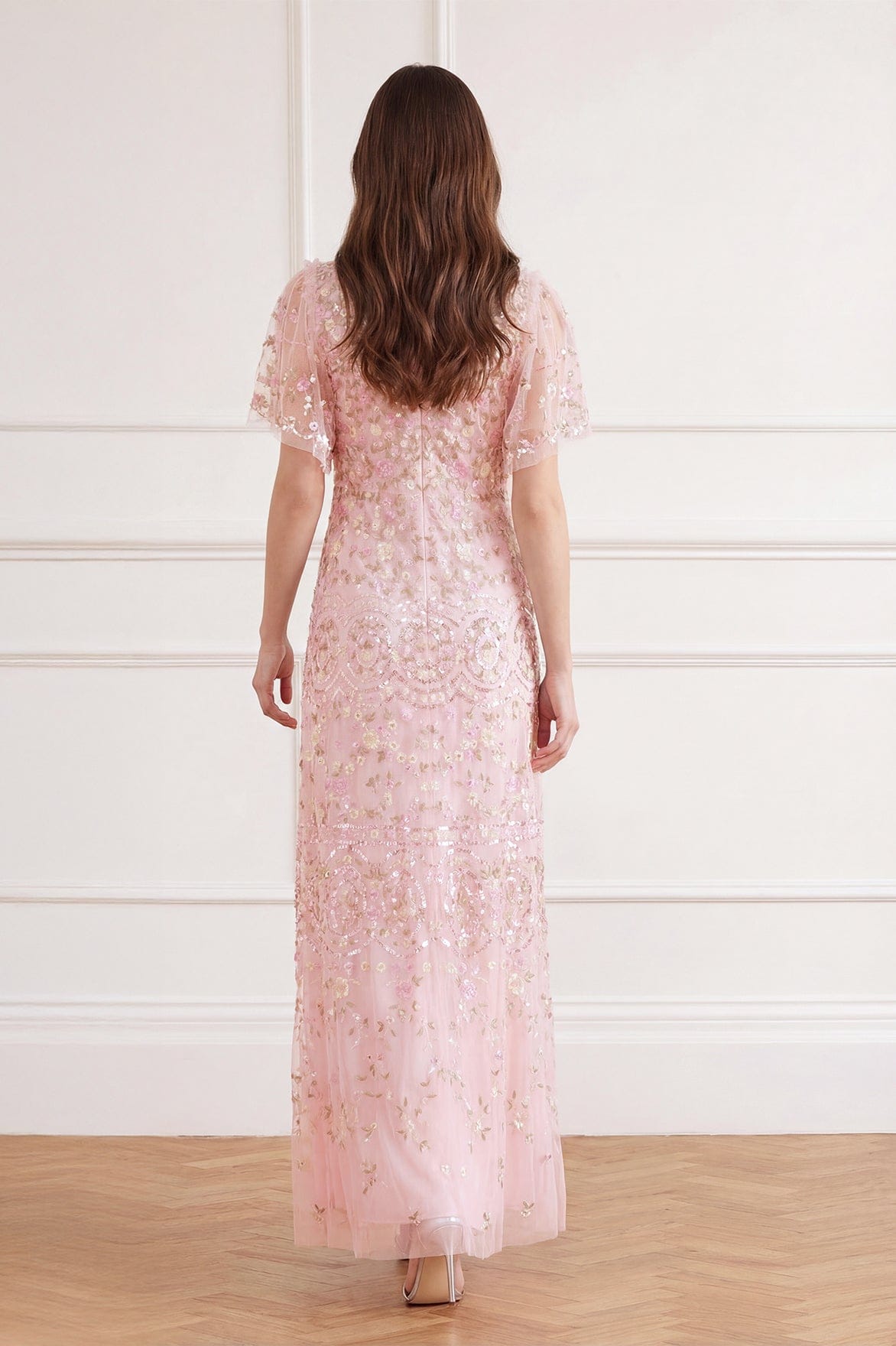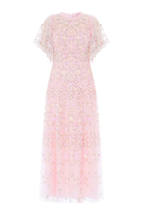 NEW SEASON. The Sweet Petal Short Sleeve Gown in Peony Pink/Multi. Inspired by scattered garden petals, this romantic gown features delicate floral detailing across a flowing silhouette. Finished with short sleeves and a softly moving skirt for effortless, feminine occasionwear.