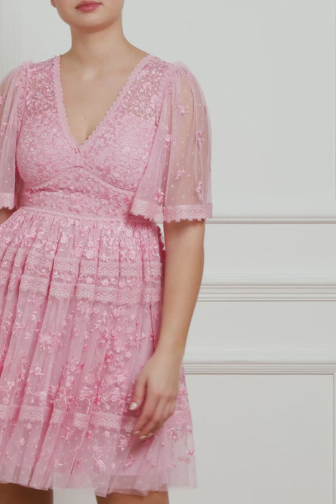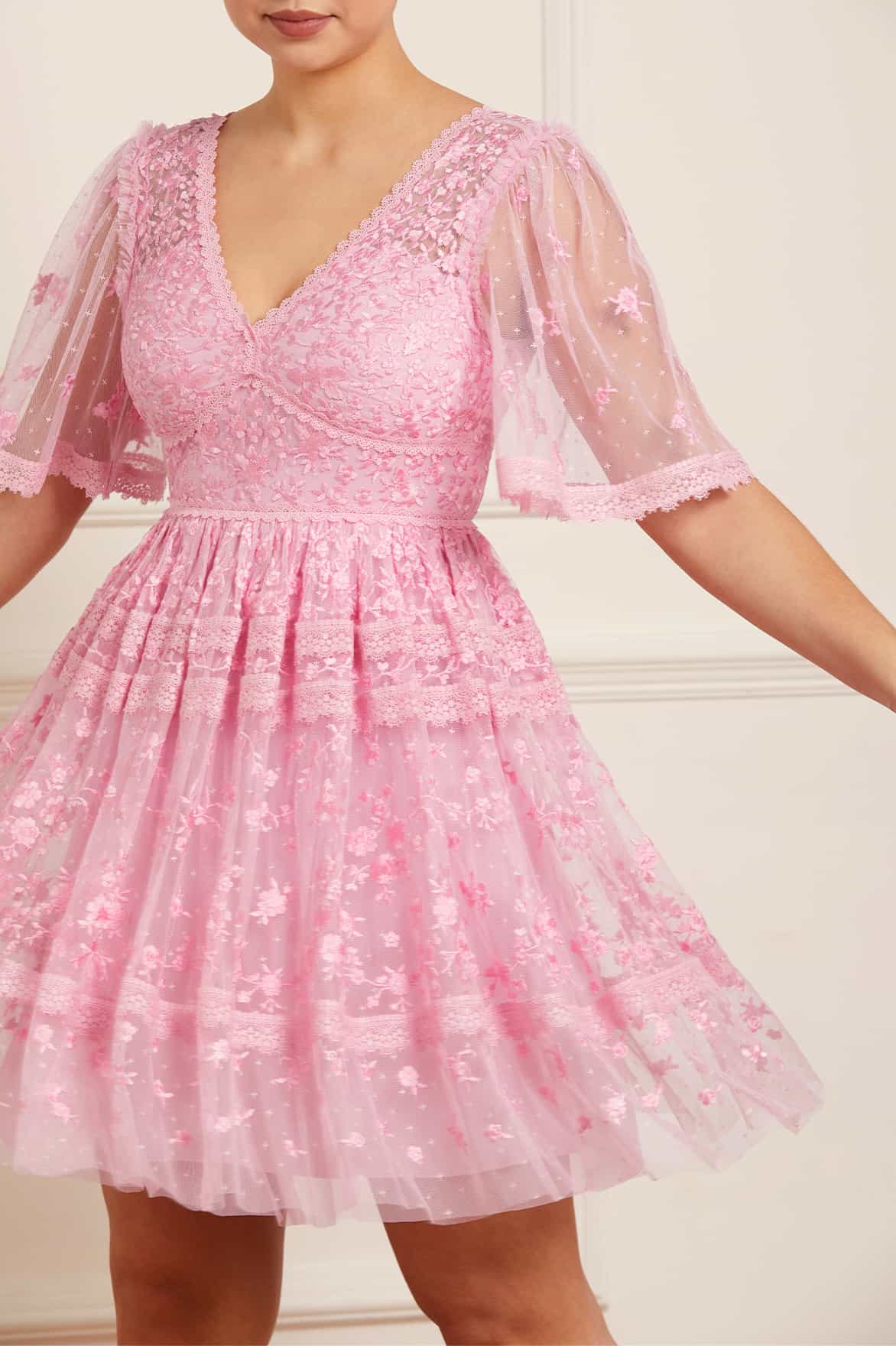 The Sweetheart Lace Mini Dress in Bright Pink. A signature Needle & Thread style, delicately embroidered with a floral lace artwork. Designed with intricate trimmed lace in pretty border motifs and perfectly positioned tiers through the skirt. Crafted from soft, kisses tulle creating a romantic texture throughout. The perfect mini dress to take you from day to night.