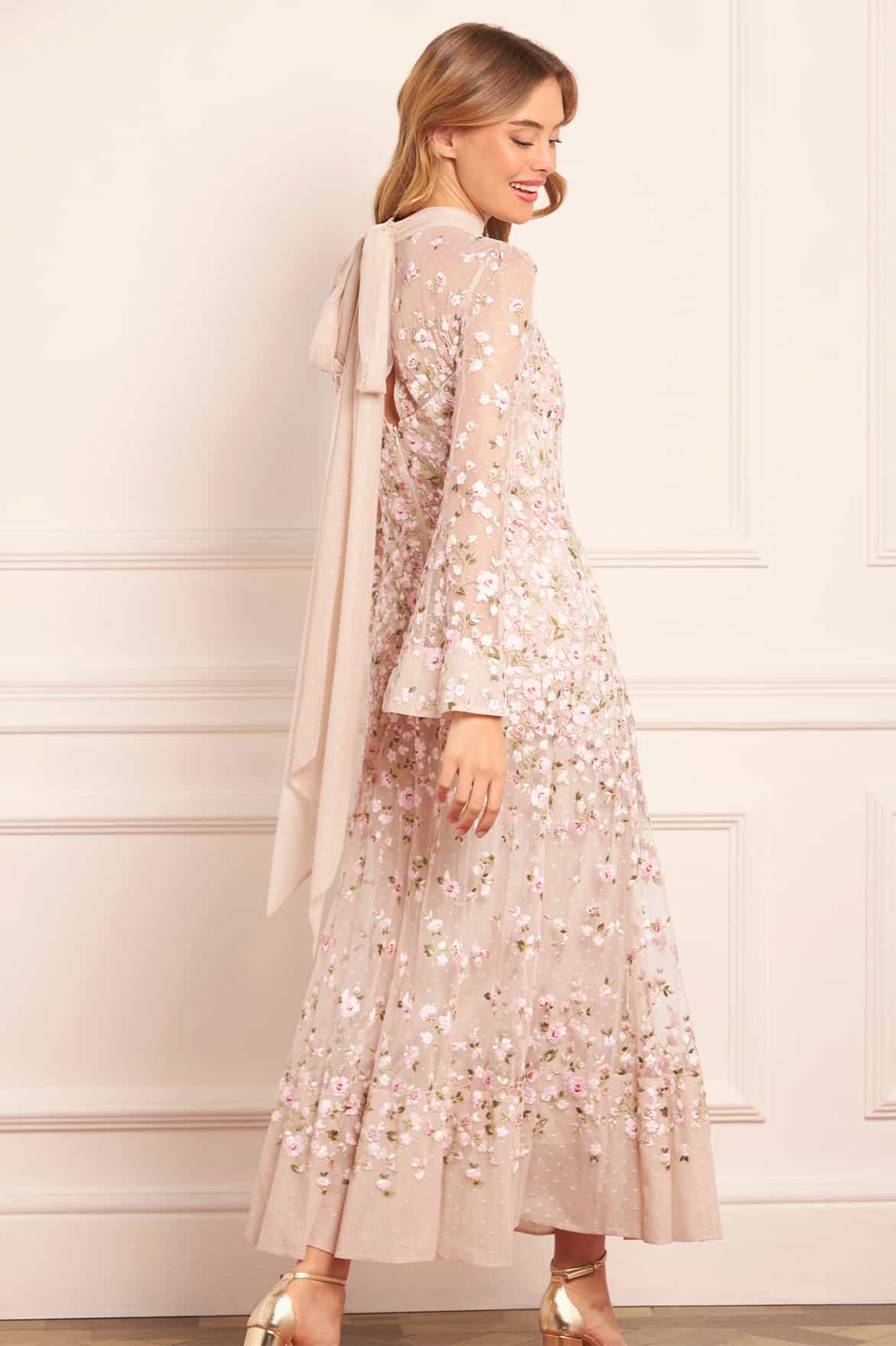 NEW SEASON. The Sylvia Rose Long Sleeve Ankle Gown in Oyster/Multi. Crafted in layers of fine tulle, the gown features long sleeves and a slim, floor-length silhouette and reflects archival florals, through richly embroidered rose motifs scattered with ditsy blooms. The oyster base softens the multi-coloured embroidery, evoking the painterly romance of Victorian design reimagined for today.