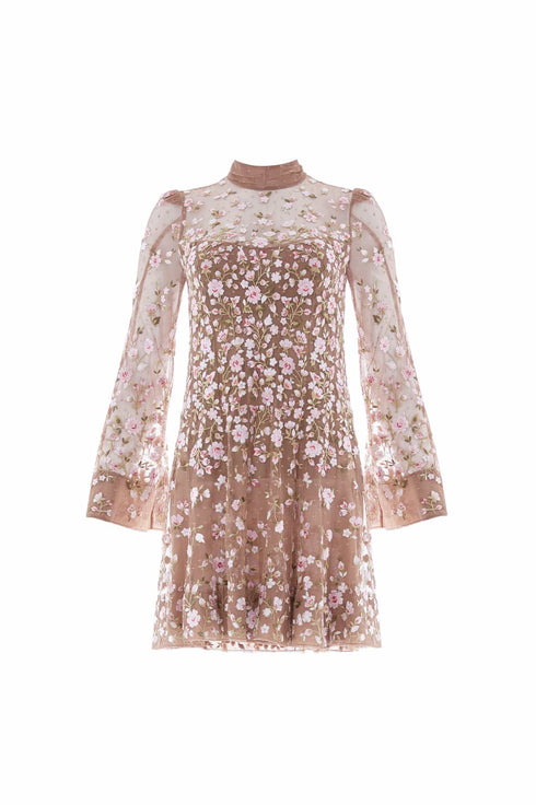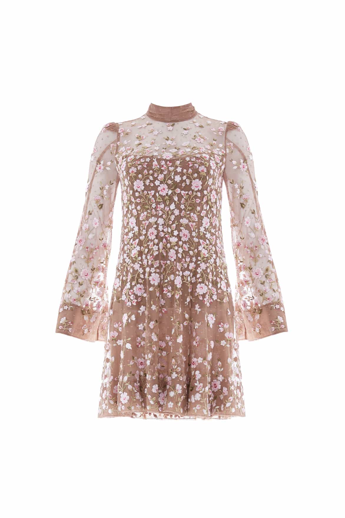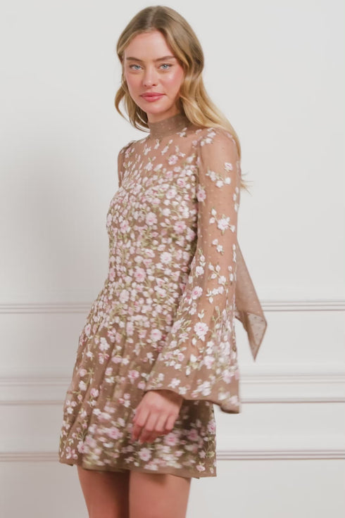 NEW SEASON. The Sylvia Rose Long Sleeve Micro Mini Dress in Warm Taupe. Embroidered roses in tonal threads scatter across soft tulle, paired with long sleeves for coverage. The micro mini length introduces youthful energy, while the warm taupe palette ensures timeless femininity.