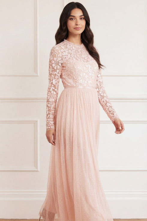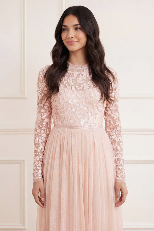 NEEDLE & THREAD EXCLUSIVE. The Tempest Bodice Gown in Strawberry Icing / Pink. Inspired by a vintage lace tablecloth design, this beautiful gown is embellished with shimmering sequins all over the bodice. Designed with long sleeves, a tulle multi-layered skirt and frill trim detailing around the neck. Make an entrance in the Tempest.