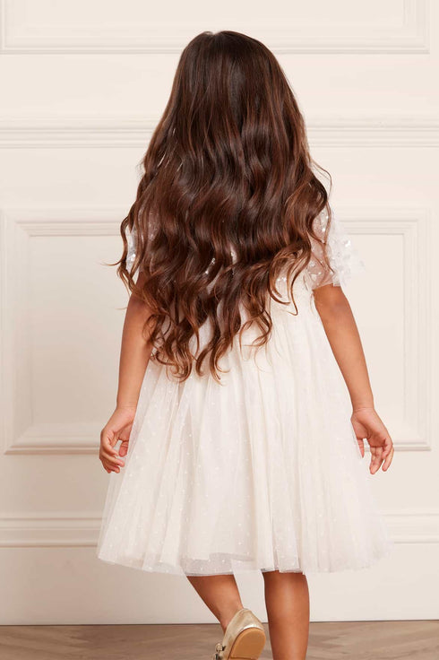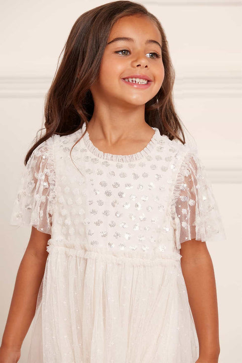 The Thea Bodice KIDS Dress in Cream / Silver. The bodice of this dress is beautifully adorned with sequin dot motifs creating a playful, shimmering effect. Designed with a signature Needle & Thread skirt, made with layers of frothy tulle. The perfect dress for an upcoming special occasion.