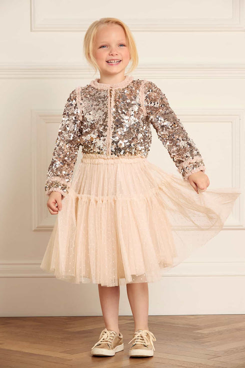 The Tulle KIDS Skirt in Dust Beige. The skirt is developed with layers of net and tulle for a floaty, playful hemline. Designed with a tiered hem frill for extra frothy, voluminous styling—perfect for twirling. Adorned with signature Needle & Thread frills at the waistband and skirt tier. Designed to be styled with our Hallie Kids Bomber Jacket, to create the perfect statement party co-ord.
