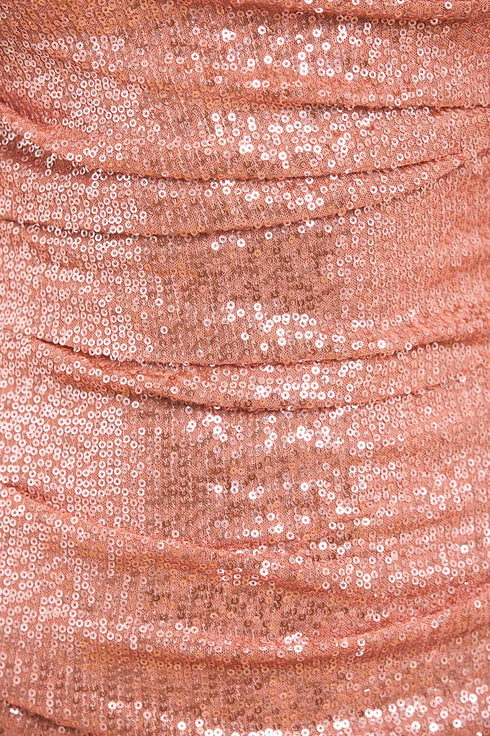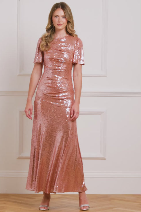The Valentina Round Neck Gown in Cinder Rose. This gown is a sophisticated style featuring sequins that shimmer and shine. The round neckline and cap sleeves create a flattering upper silhouette, while the ankle-length hem adds elegance. Perfect understated glamour for unforgettable moments.