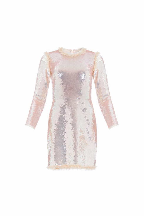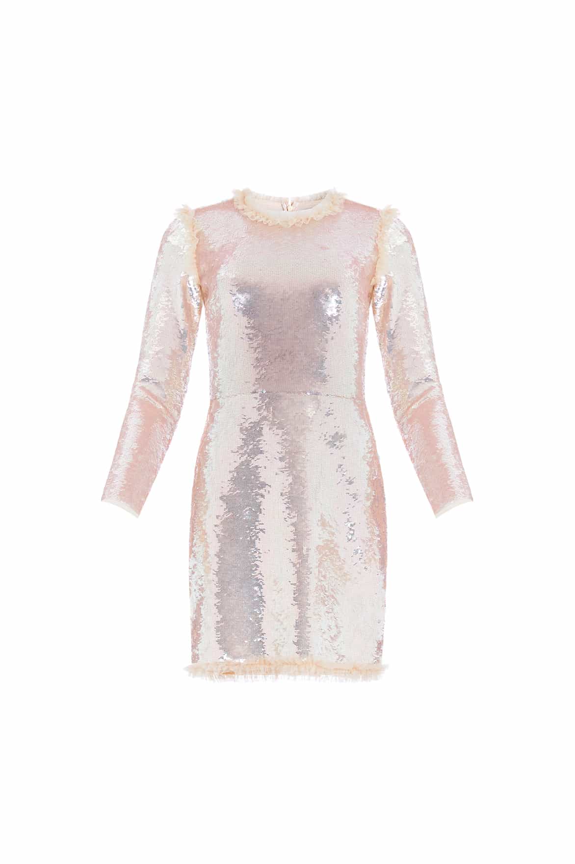 The Valerie Gloss Long Sleeve Micro Mini Dress in Beige / Gold. The statement dress of the season. This dress is decorated with high-shine gloss sequins creating a foil coating mirror effect. Developed with high powered mesh to create a figure-hugging silhouette that allows the dress to stretch and form around your body shape. Crafted with signature Needle & Thread frill details for the perfect finish. We hope you love the Valerie as much as we do.