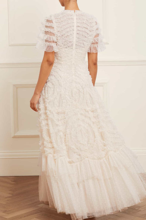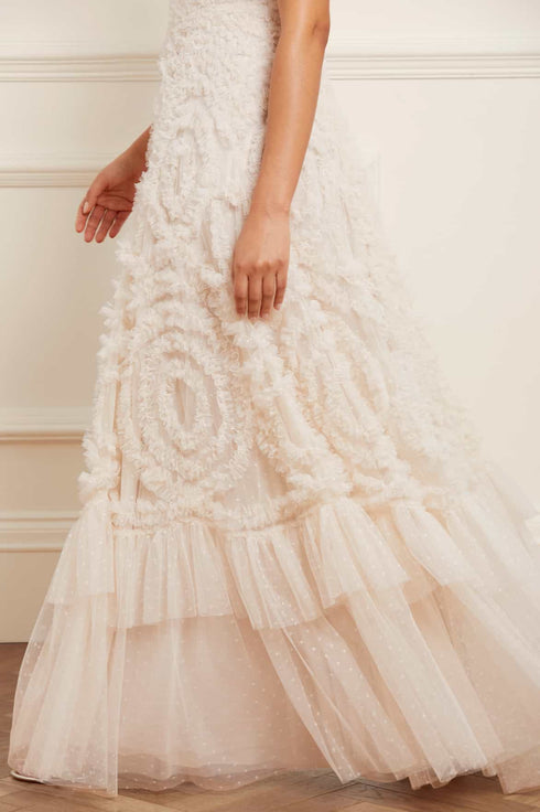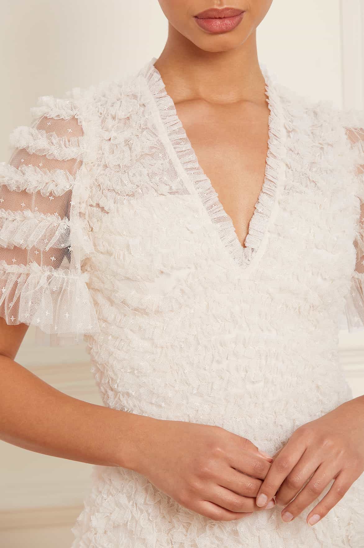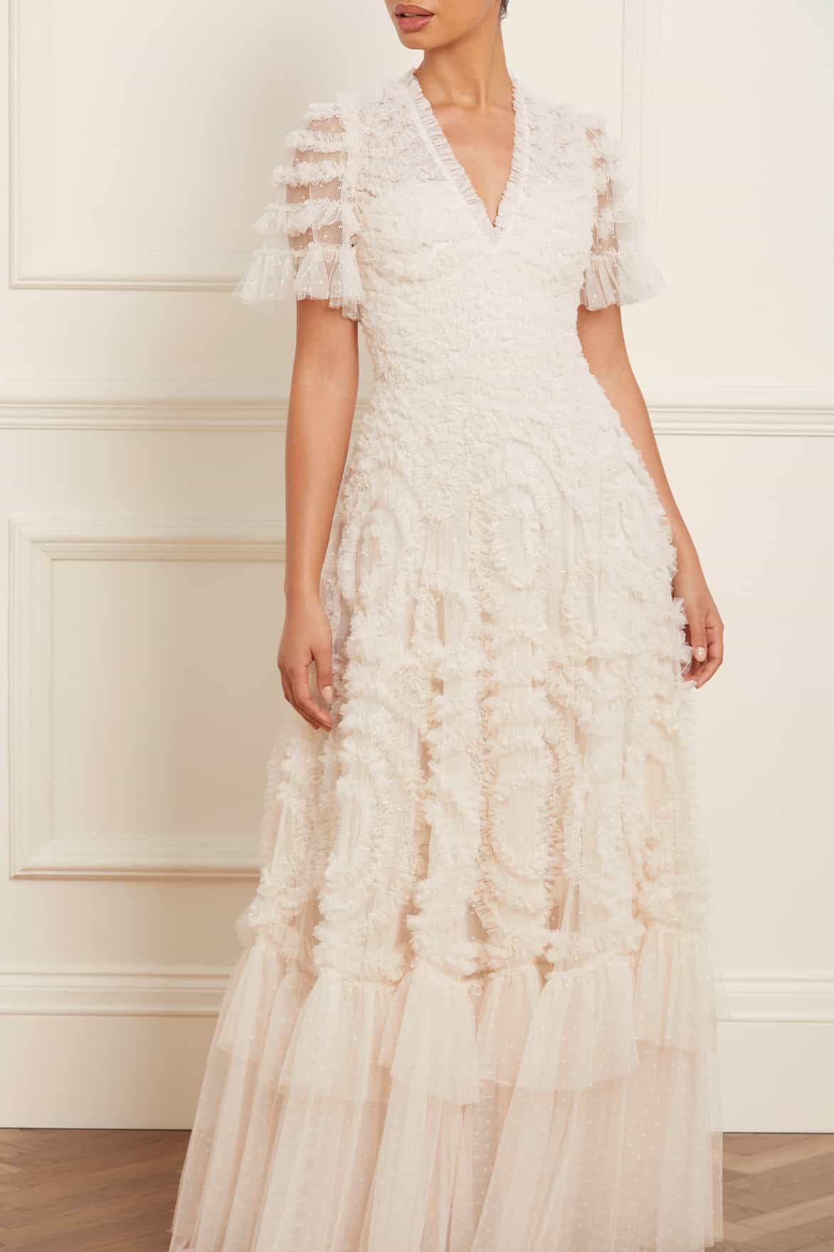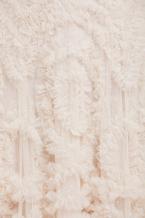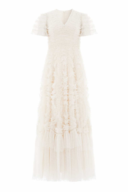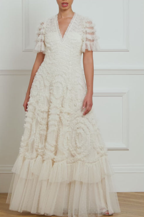 The Verity Ruffle V-Neck Gown in Cream. A brand new style for the season ahead. This textile piece is designed with signature Needle & Thread detailing. Beautifully developed with romantic, frothy tulle and delicate ruffles, creating a beautiful artistic effect and flattering shape. Make a statement in the Verity.