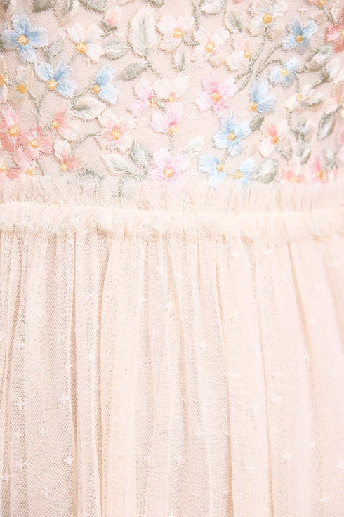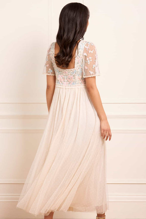 The Versailles Ditsy Bodice Ankle Gown in Cream. Inspired by the opulent interiors of the Palace of Versailles, this enchanting gown features intricate multicoloured floral embroidery, densely stitched across the bodice and softened with delicate ditsy motifs along the sleeves. The short sleeves are finished with a fine lace trim, adding a touch of vintage elegance. A square neckline and waist are adorned with signature Needle & Thread tulle frills, enhancing the gown's romantic charm. The skirt cascades in layers of soft, voluminous tulle, creating graceful movement and timeless femininity.