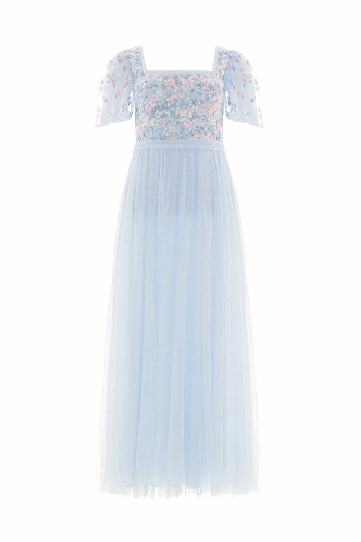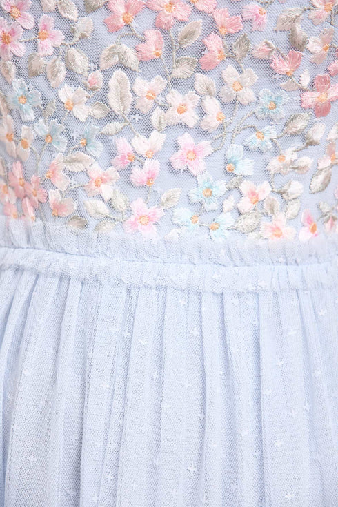 NEW SEASON | NEEDLE & THREAD EXCLUSIVE. The Versailles Ditsy Bodice Ankle Gown in Dusk Blue. Inspired by the opulent interiors of the Palace of Versailles, this enchanting gown features intricate multicoloured floral embroidery, densely stitched across the bodice and softened with delicate ditsy motifs along the sleeves. The short sleeves are finished with a fine lace trim, adding a touch of vintage elegance. A square neckline and waist are adorned with signature Needle & Thread tulle frills, enhancing the gown's romantic charm. The skirt cascades in layers of soft, voluminous tulle, creating graceful movement and timeless femininity.