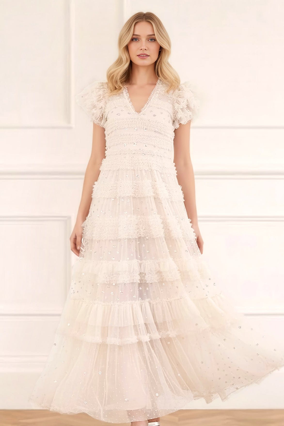 The Vivian V-Neck Gown in Cream. A signature Needle & Thread style statement. Beautifully printed with sequin polka dot motifs scattered throughout, creating an enchanting shimmer. Adorned with specially sourced sequins to create a sparkling effect throughout. This romantic style features tulle frills in perfectly positioned rows, creating a soft, frothy texture. Developed with generous ruffled sleeves and a V-neckline for a contemporary look. A style you'll wear time and time again.